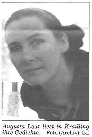 Am Freitag den 2. Juli wird sie im Rahmen des Kraillinger Kult‑Art‑Festivals lesen. Der Tod war der ständige Begleiter der Dichter der Romantik. Der Tod, und nicht nur er, sondern Grausamkeit und Verzweiflung, damals in fließenden Sprachmelodien und heute, zerhackt in Begriffe und Bilder, in allen Medien präsent, haben auch in Augusta Laars Gedichten ihren Platz.