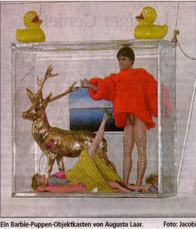 Die Installationskünstlerin, Musikerin und Lyrikerin Augusta Laar aus Krailling verwendet seit langem Puppen, besonders Barbie-Puppen, in ihn Gestaltungen. Hinter Flitterglanz, schönem Schein verbirgt sich Depression, die abgerissenen Glieder erzählen nicht nur von äußerer Zerstörung. Das Barbie-Paar, zusammengepresst in einer Vitrine mit all dem Plastikkram um sich herum, erstickt in der erdrückenden Umgebung. Die Zusammenstellung von Barbie-Meerjungfrau zwischen Fischlein, einem Baby und einem Kapitän erzählt eine traurige Geschichte.