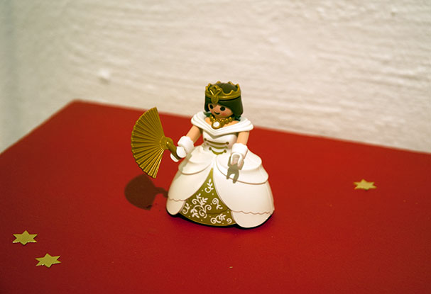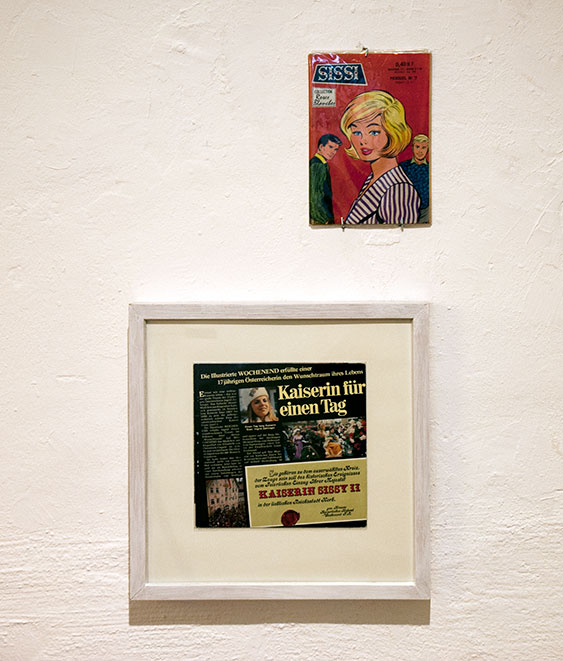 2013. Installation. Dimensionen variabel, Sisi Playmobil Figur, Sisi Comic (Frankreich 1962), Plattencover, Schlüsselanhänger Sisi-Souvenir, roter Sockel, Lautsprecher, Audio Zuspieler